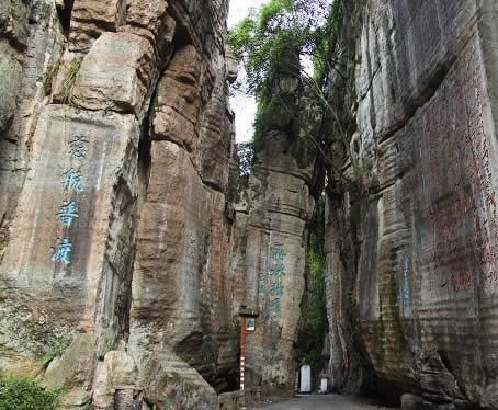 清嘉慶年間辟有洗心池!安欢T(mén)”如斧斫神劈,為石林天成,石林壁上鐫滿歷代文人的詩(shī)詠。這里古柏參天,藤蘿倒掛,環(huán)境幽美。有壁石如書(shū)的萬(wàn)卷書(shū)者,有嵐霧束腰的七級(jí)青石培英塔。凝神盤(pán)坐的南海觀音是一塊天然造型的巨石,惟妙惟肖。觀音巖周?chē),環(huán)繞著具有明清風(fēng)格的地藏庵、嵩山堂、水府閣等建筑物,布局靈巧緊湊,主題鮮明,因勢(shì)造景。景點(diǎn)間曲徑迂回,迷趣深?yuàn)W,稱(chēng)八陣圖。景區(qū)內(nèi)的河灘上有兩處溫泉,氤氳縈繞,水溫適宜(41℃),水質(zhì)良好,能治療多種疾病?h城人民經(jīng)“不二門(mén)”前往溫泉就浴者絡(luò)繹不絕,現(xiàn)又增建了石牌坊和民俗博物館。