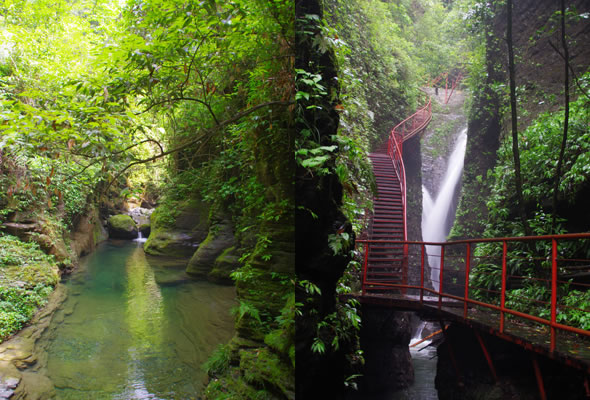 十八潭總名。稍作休憩,我們開始奔赴東線的景點(diǎn)。東線主要是以十八潭為主,下游有4潭:合潭、梳妝潭、魚潭、黑潭;中游有9潭:換衣潭、美人潭、石蛙潭、姊妹潭(3個(gè))、情侶潭(2個(gè))、二龍搶珠,上游有5潭:鬼谷神功(2個(gè))、幽潭、落銀潭(彩虹潭)、路邊潭。十八個(gè)潭深淺不一,淺則1米以上,深則4米左右,形狀各異,有的月牙形,有的豬腰狀,形狀不規(guī)則,石壁上水沖成潭,真是鬼谷神功,此處水質(zhì)細(xì)膩,加之綠林映襯,水色碧綠見底,猶如十八顆翡翠石鑲嵌在山林之間,涓涓溪流晶瑩剔透,飛流直下的瀑布,氣勢磅礴,蔚為壯觀, 下游的4潭,合潭、梳妝潭、魚潭、黑潭。合潭是仙女峽谷與十八潭的交匯處;梳妝潭的水清如明鏡,又因?yàn)樘秲蓚?cè)石頭的封閉,使這面鏡子靜止不動,很方便梳妝,照鏡子。在梳妝潭周圍,有一種植物屬于紅豆杉系列,它的形狀好似梳子,可以用來梳頭。魚潭可不能望文生義。魚潭,是在冬天的時(shí)候,所有的魚都聚集在這里過冬,除此之外,這個(gè)潭水淺見底,冬天魚苗聚集,是捕魚的好季節(jié)。黑潭,水深不見底,所以叫黑潭,F(xiàn)在已經(jīng)看不見梳妝潭、魚潭、黑潭了,你猜為什么?建水庫,建水上樂園,淹沒了。 斷魂石的傳說。三國時(shí)期,高氏和蕭氏一對夫妻春節(jié)忙活,遇上了天門垮眼,受余震襲擊,打死了丈夫蕭氏。高氏思念丈夫,淚哭不斷,結(jié)果摔死潭中。人們經(jīng)常還能聽到哭聲傳來,不敢單獨(dú)行走,需成群結(jié)隊(duì)。后人為了鎮(zhèn)邪,雕刻一條蜈蚣驅(qū)趕哭魂,多年后,蜈蚣成精,天上打雷,巖石發(fā)光,遭雷所劈,成了斷魂石。 和尚姥,也就是丹灶峰,天門十六峰之一。相傳此峰為仙人化身,赤松子曾在此煉丹,許多詩人在此留下了美妙的詩篇,明代葉守禮《丹灶峰》: 懸崖峭壁隔塵寰,上有仙人學(xué)煉丹。 煉得丹成鶴已去,獨(dú)留丹灶在峰巒。 意思是說,在這險(xiǎn)峻秀麗的山峰上,赤松子潛心煉丹,不受塵世干擾,身心沉醉于秀美的山間,沉溺于丹藥的煉制之中。作者很是羨慕那種與世隔絕的超脫,那種執(zhí)著于自我理想的瀟灑,你羨慕不羨慕? 竹林叢生。我們要學(xué)習(xí)竹子的精神,中空、謙卑;我們要學(xué)習(xí)竹子的精神,抱團(tuán)生長;我們要學(xué)習(xí)竹子的精神,破土而出,節(jié)節(jié)高。 向家塔。打造農(nóng)耕養(yǎng)生游的地方。種田、種菜、種花,農(nóng)家餐館。 爛泥巴根。爛泥巴根和馬桑樹是同科,是這里獨(dú)特的一種樹。馬桑樹亦稱“千年紅”、“馬鞍子”,屬落葉灌木,馬桑樹多枝叢生,一簇一簇的,枝葉像傘蓋,因此“馬桑樹兒搭燈臺”。春風(fēng)一吹,滿山的馬桑樹、爛泥巴根就吐翠滴綠,顯示出強(qiáng)勁的生命力。打油詩一首: 青青枝條四方走, 肥肥大葉落上頭, 身在路邊無人問, 冬去春來樂悠悠。 秋天死亡,春天長勢更加茂盛,它的新生是通過死亡實(shí)現(xiàn)的。山川如此,植物也是如此,這里的一草一木無不透露著道家那種齊生死、等貴賤的精神。 這叫“常道”亭,“道可道,非常道”,據(jù)說是白狐與劉海相遇的地方。吊橋。 十八潭各具特色。 中游有9潭。第五潭叫換衣潭。巖石聳立,霧氣氤氳,巖壁上布滿水汽,猶如雨下。又因過道狹窄,行人需彎腰通過,未免雨水打濕衣裳,在此就要脫下身上衣物,通過后在第六潭再穿上。因此第六潭又叫美人潭,很幽深神秘的。第七潭叫石蛙潭,水淺,又比較平穩(wěn)、安全,春天產(chǎn)籽。余音回響,猶如蛙鳴,給人“聽取蛙聲一片”的錯(cuò)覺。 對面巖壁叫“臘肉鋪”,那條自上而下的溪流叫“酒長流”,客人來了,咱土家人熱情,臘肉下炕,苞谷燒,喝兩口! 第八潭第九潭叫情侶潭,比較隱蔽,他倆靜悄悄地談著情話,我們快走,不要打攪他們。 第十潭、十一潭、十二潭叫姊妹潭。下面那個(gè),水淺淺的,溫溫的,是幺妹潭,中間那個(gè)是二哥潭,上面那個(gè)是大哥潭。 潭的旁邊有珍稀植物馬蘭花,馬蘭花又名蝴蝶花、蝴蝶蘭,為多年生宿根草本花卉,根莖短粗,肥壯;ù笮缕妫ㄉk麗,鮮艷奪目;ㄓ兴{(lán)、白、黃、雪青等色;ㄆ5-6個(gè)月,每次花可開花7-10天,頗耐觀賞。馬蘭花在我國栽培已有2000多年的歷史,目前歐、亞、非3洲均有分布,品種極多,難以計(jì)數(shù)。此花按植株高度不同可分3種類型:矮株型僅18-25厘米,中株型高25-70厘米,高株型可高達(dá)120厘米。馬蘭花喜陽光,適栽于背風(fēng)向砂質(zhì)土壤中。 馬蘭開花的童謠。他們?nèi)⒚眯r(shí)候情感深厚,常常一起跳皮筋。大家會跳嗎?會唱嗎? 小汽車,滴滴滴,馬蘭開花二十一, 二五六二五七,二八二九三十一, 三五六三五七,三八三九四十一, 四五六四五七,四八四九五十一, 五五六五五七,五八五九六十一 ! 還有紅豆杉,像梳頭的篦子,叫“篦子三尖杉”。還有蘭心草,中草藥,空中飄來蘭花的香氣,山谷中峭壁的蘭花,如芳芳人品善良高雅。蘭花如人品有宜人的香氣,蘭花有撩人的幽香,任何花卉的香氣都不能與蘭花比。這幽香時(shí)隱時(shí)現(xiàn),時(shí)濃時(shí)淡,時(shí)遠(yuǎn)時(shí)近。飄蕩在老道灣山谷中,給人清新和愉快的感受。 蘇轍有詩:“谷深不見蘭生處,追逐微風(fēng)偶得之”。 還有大葉榕、玉葉金花、秋海棠、臘蓮繡球、四字馬蘭、紅楓,秋天來臨,看!漫山紅遍,層林盡染。 聞道亭?鬃釉唬撼劦,夕死可以。意思是說,人生悟到“道”的真諦是