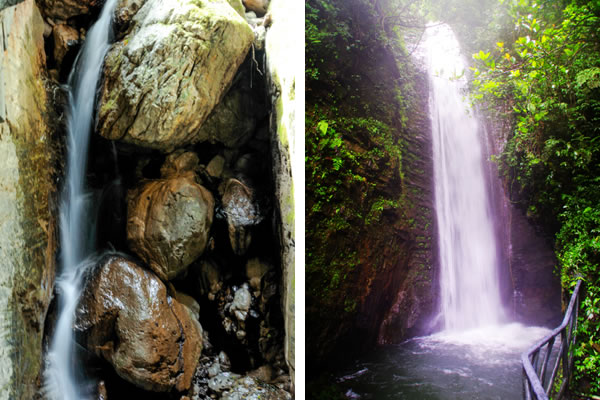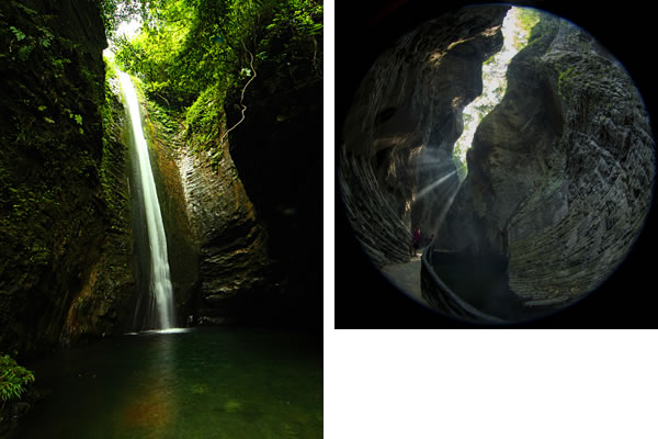 西線原名叫雪花溪,又叫雪花洞,水從懸崖上掉下來濺起水花,泉水與巖石相碰,落成大霧,形成雪花狀,故名雪花溪。因地勢險(xiǎn)峻,歷代人都沒有把雪花溪走通過,從下往上看深不見底,古人以為是一個洞,故又叫雪花洞,其實(shí)是一個峽谷,有七潭七瀑,現(xiàn)在叫“仙女峽谷”。峽谷長800米,最窄處僅1米左右,上下落差近200米,因水的長期回旋沖刷, 巖層的堅(jiān)硬度各異,形成了底寬頂窄,時北,時西,時東,陰暗無光,形似溶洞, 泉水飛流直下,形成梯級瀑布,擊打在巖壁上濺起的水花猶如雪花飛舞,潭中一片雪白,古人稱之為雪花洞,峽谷中有七個各異的潭池在沖擊的水花中若隱若現(xiàn),故改稱為七仙女人間沐浴瑤池,從開天辟地起無人行通過,現(xiàn)在已修好的占道,于峽谷水花之中,幻入仙境之感。