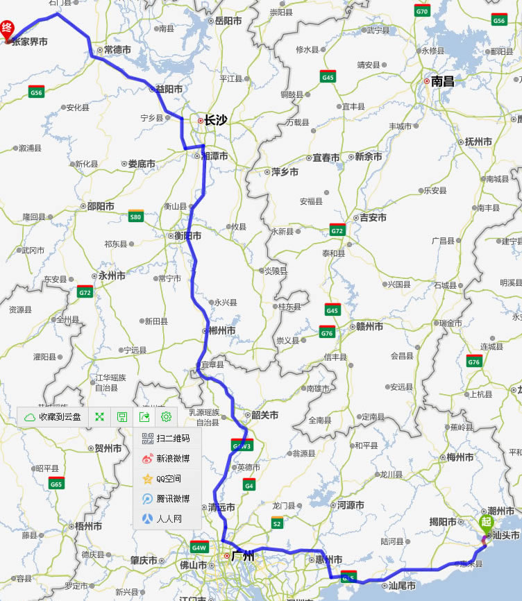 左右,沿途經過汕頭——汕尾市——惠州——廣州市——清遠——英德市——韶關市——樂昌市——宜章縣——郴州市——耒陽市——衡陽市——湘潭市——寧鄉(xiāng)縣——益陽市——常德市——慈利縣——張家界。