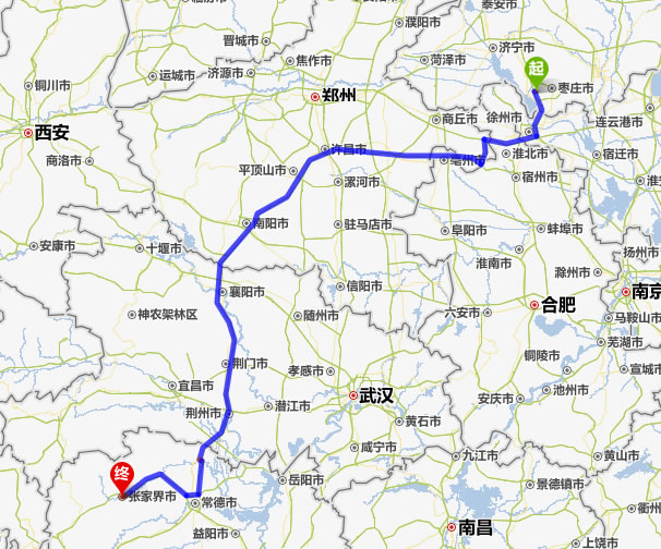 左右,沿途經過棗莊——徐州——毫州——許昌——平頂山——南陽——襄陽——荊門——荊州——常德(也可以走國道經澧縣、石門縣)——慈利——張家界。
