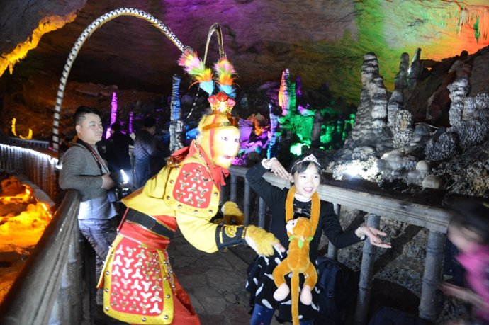 手持金箍棒,頭戴紫金冠。2月2日,農(nóng)歷臘月二十四,中國傳統(tǒng)小年節(jié)氣。當天下午,旅游勝地張家界武陵源黃龍洞景區(qū),一名“美猴王”打扮的特殊游客現(xiàn)身“后天”雕塑、龍宮大廳、花果山等景點,其惟妙惟肖的“孫悟空”動作表演,不時引來其他游客的驚呼:大圣歸來!