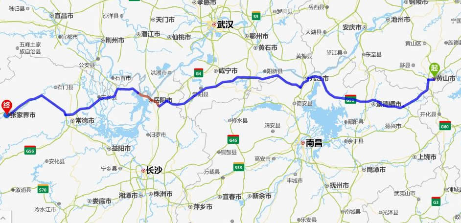 左右,沿途經過黃山——景德鎮(zhèn)——九江——陽新縣——崇陽縣——岳陽——安鄉(xiāng)縣——常德市——慈利縣——張家界。