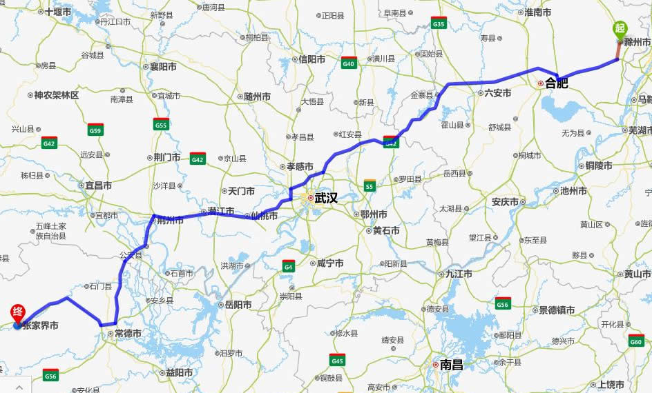 左右,沿途經過滁州——合肥——六安——金寨縣——麻城市——漢川市——仙桃市——潛江市——荊州市——公安縣——澧縣——常德(也可以走國道經澧縣、石門縣)——慈利——張家界。