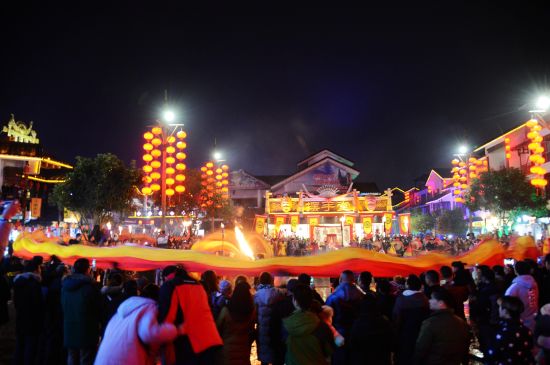 火龍出場,街區(qū)狂舞;盤龍點(diǎn)睛,眾人祈福。12月21日,農(nóng)歷冬至,當(dāng)天夜晚在旅游勝地張家界武陵源區(qū)溪布老街?jǐn)[手堂廣場啟動的 “武陵腔調(diào):趕火趕戲趕大年”活動儀式上,一條全身似火的長龍?jiān)诮倜良覂号奈鑴酉?“閃亮”登場,格外耀眼。據(jù)了解,這條長龍身有香味,全長108米,是目前世界最長的香火龍。