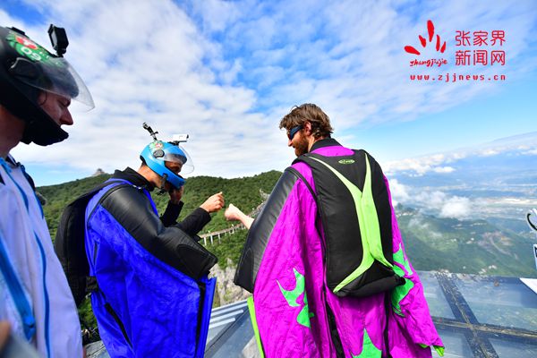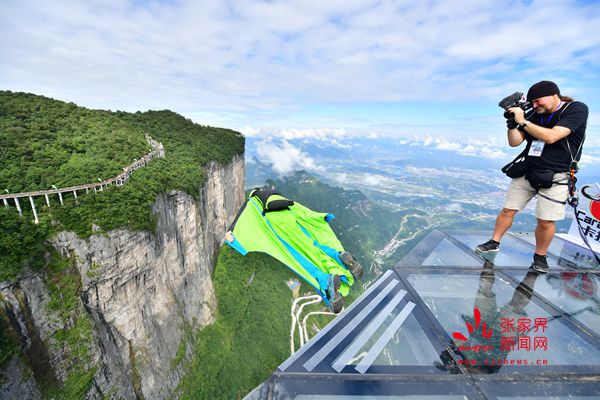 2017世界翼裝飛行世錦賽將于9月8日-10日在張家界天門山舉辦。開賽在即,9月7日上午,來自全球11個國家的16名翼裝飛行員從海撥1458米的張家界天門山玉壺峰頂一躍而下,在奇峰險壑間進行競速訓(xùn)練。