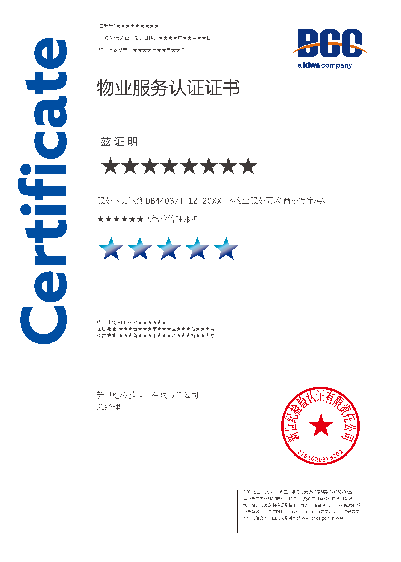 依據(jù)GB/T20647.9 《社區(qū)服務(wù)指南 第9部份:物業(yè)服務(wù)》標(biāo)準(zhǔn)要求,對企業(yè)進(jìn)行物業(yè)體系審查。認(rèn)證審查的結(jié)果是證明企業(yè)按照標(biāo)準(zhǔn)實施了物業(yè)服務(wù),并達(dá)到了某一個高度(星級)。它是評分制的認(rèn)證標(biāo)準(zhǔn),按評價的分值來衡量服務(wù)能力的高低。