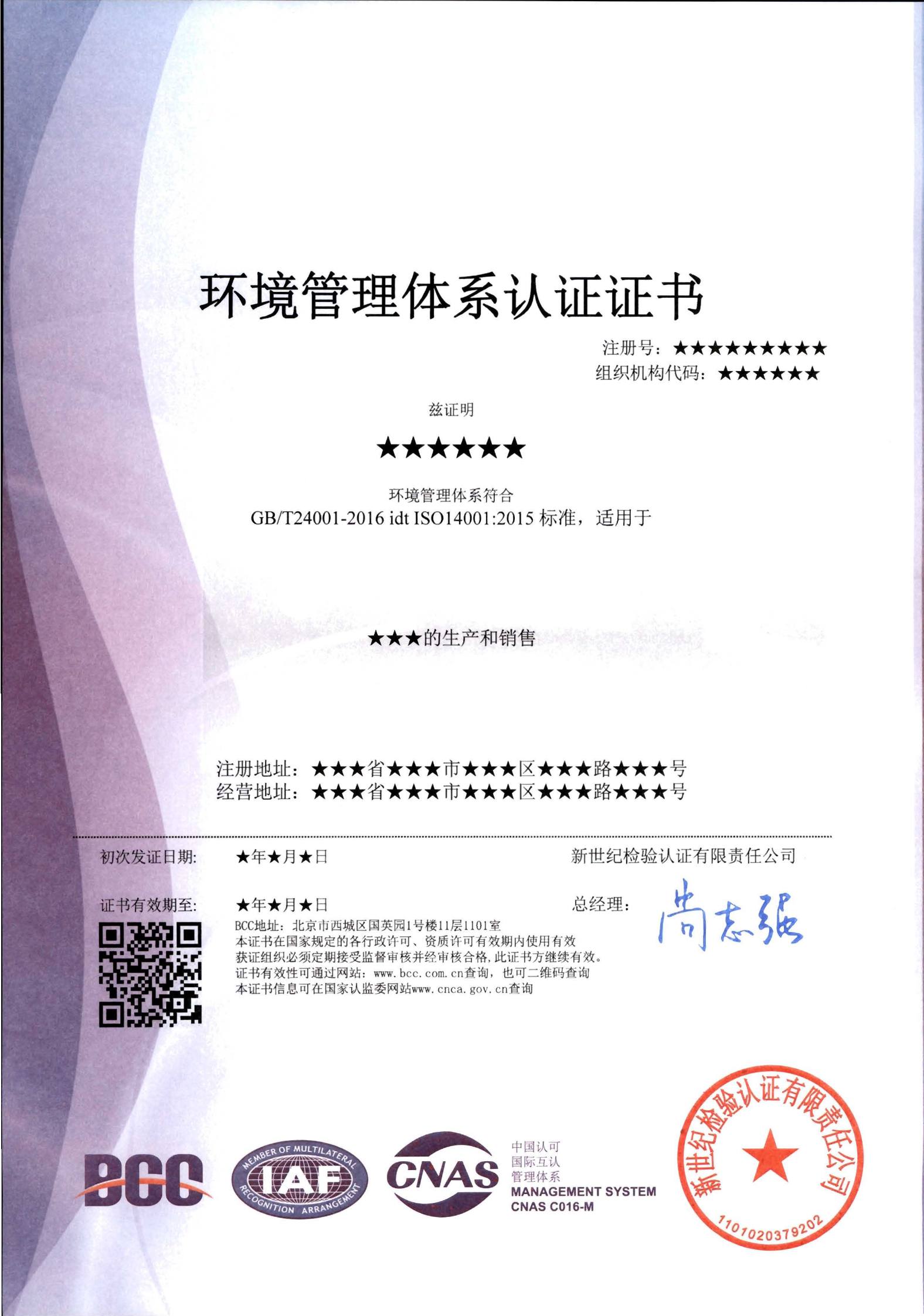 你好,環(huán)境管理體系認(rèn)證書(shū)樣本每個(gè)認(rèn)證機(jī)構(gòu)都是不一樣的。但是證書(shū)上一定有認(rèn)證的標(biāo)準(zhǔn)、標(biāo)志、產(chǎn)品范圍等信息。